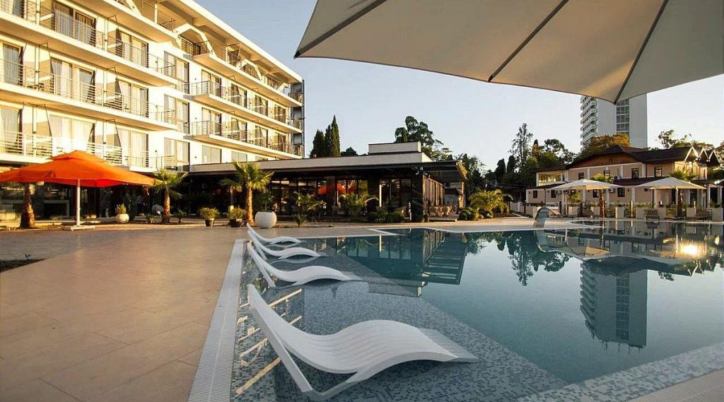 В номере с видом на бассейн имеется балкон, кондиционер, телевизор, телефон, мини-бар, сейф. Для размещения предлагается двуспальная кровать. Среди прочих удобств бесплатный Wi-Fi, халаты, тапочки, набор для приготовления чая и кофе. Ванная комната с душем, феном и набором гостиничной косметики.