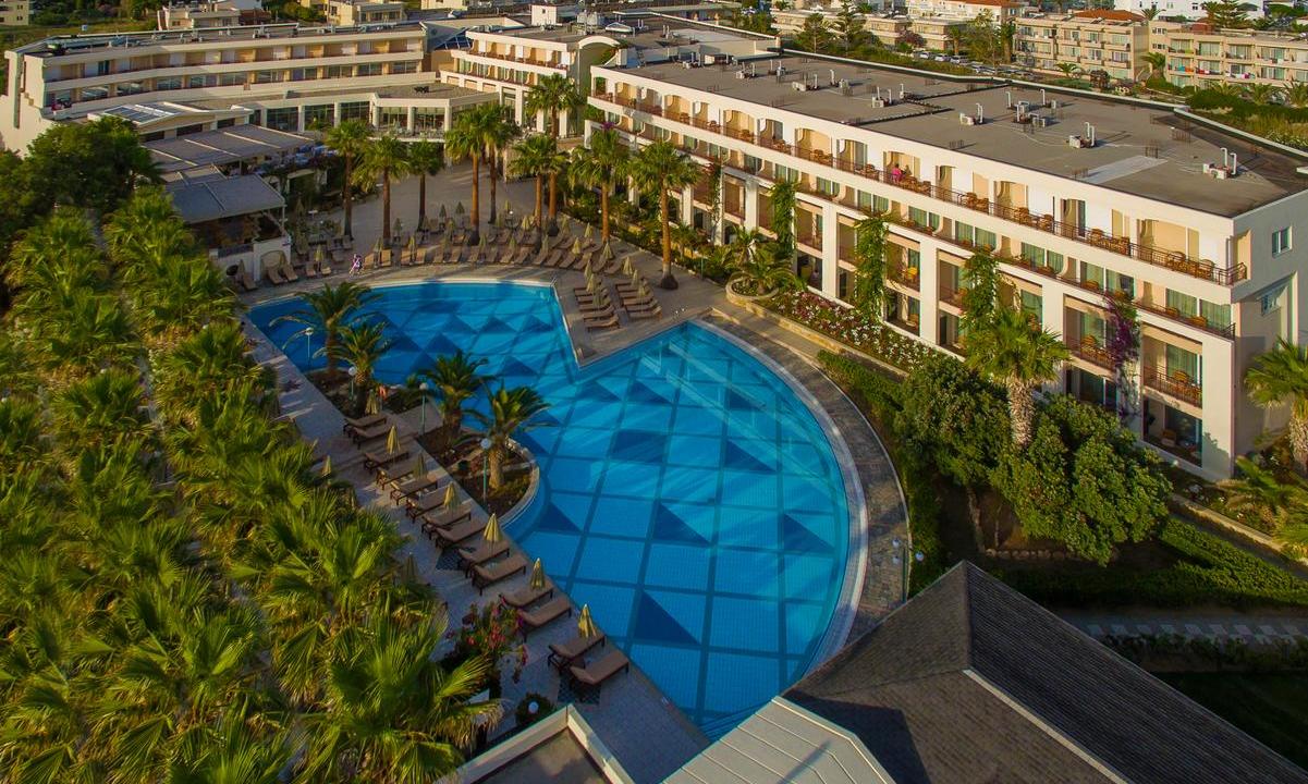 Древнегреческие мотивы присутствуют не только в архитектуре гостиничного «акрополя», но и во внутреннем оформлении холлов и жилых помещений – мрамор, статуи и колонны – все, что подчеркивает присутствие стиля для построек тех времен. Сто семьдесят просторных номеров заведения состоят из основных комнат, прихожих и ванных, косметические принадлежности в которых меняются ежедневно. Радует глаз подобранная со вкусом мебель, в том числе и на террасе с видом на море, имеется спутниковое телевидение, кондиционер, холодильник, принадлежности для приготовления кофе или чая.