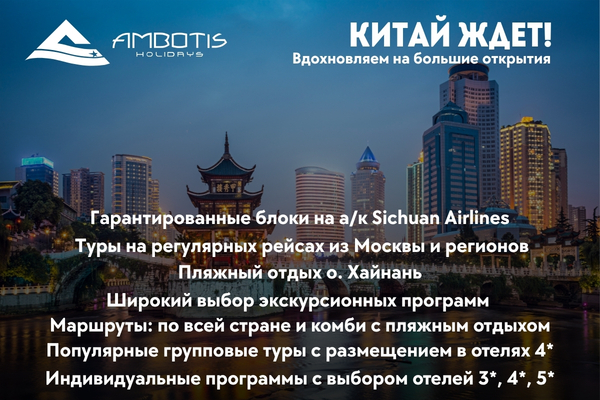 Туроператор Ambotis Holidays Russia предлагает разнообразные программы путешествий по стране. Формат поездок позволяет совместить знакомство с крупнейшими городами Китая и отдых на море.