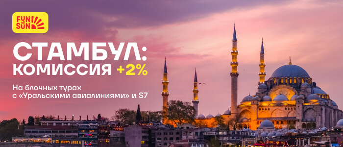 FUN&SUN повышает комиссию на блочные туры в Стамбул с перелетом авиакомпаниями «Уральские авиалинии» и S7. Успейте забронировать для своих туристов и получать дополнительную выгоду.
