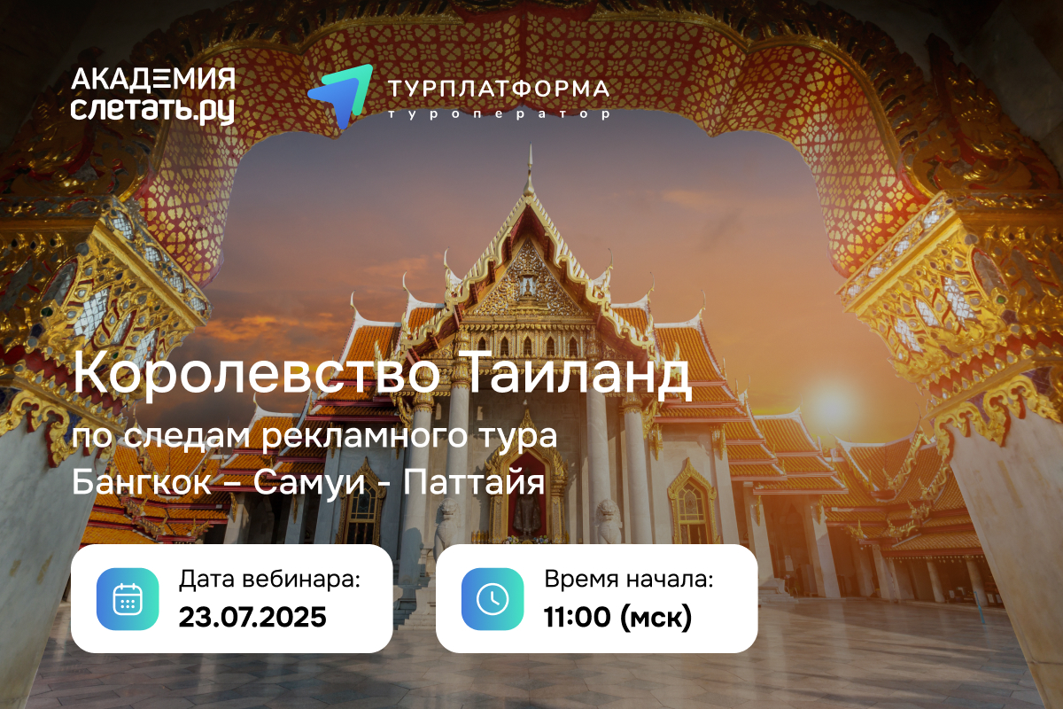 Информация, полученная не из интернета, а из опыта. Актуальная и ценная для продаж. Именно её вы получите, присоединившись к вебинару по итогам рекламного тура, который прошёл по маршруту Бангкок — Самуи — Паттайя. Успейте присоединиться, чтобы удовлетворить запросы всех категорий клиентов!