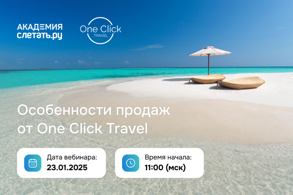 Высокий сезон не за горами, самое время готовиться и расширять свой кругозор! На новом вебинаре на площадке «Академии Слетать.ру» предлагаем вам познакомиться с молодым туроператором — One Click Travel! На каких странах специализируется, какие преимущества предлагает — расскажем совсем скоро!