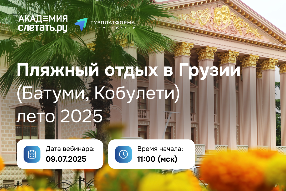 Турция, Египет, Россия и даже Таиланд — уже привычные направления, выбираемые туристами из России в качестве мест для пляжного отдыха с июня по август. Однако достойной и не столь популярной альтернативой может стать Грузия. Приятный бонус: вкусная кухня и захватывающие дух пейзажи. Почему ещё страна заслуживает внимания ваших клиентов этим летом — расскажут эксперты туроператора «Турплатформа» на новом вебинаре на площадке «Академии Слетать.ру».