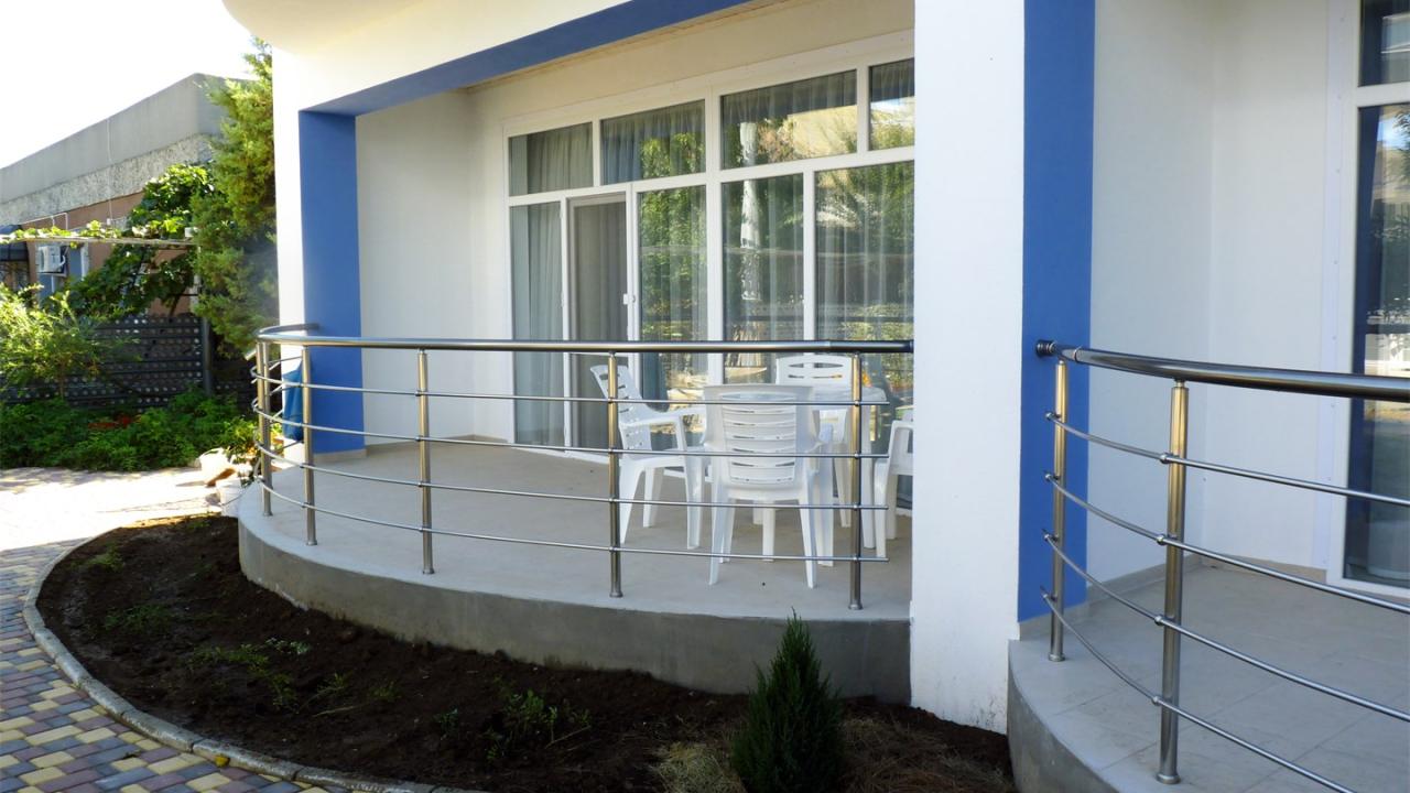 Полулюкс с террасой однокомнатный (тип 1) – площадью 28,5 кв. м., макс.размещение 3 чел., в номере две односпальные кровати, доп. место – диван, чайник, холодильник, кондиционер, ТВ, душ, терраса площадью 20 кв. м.