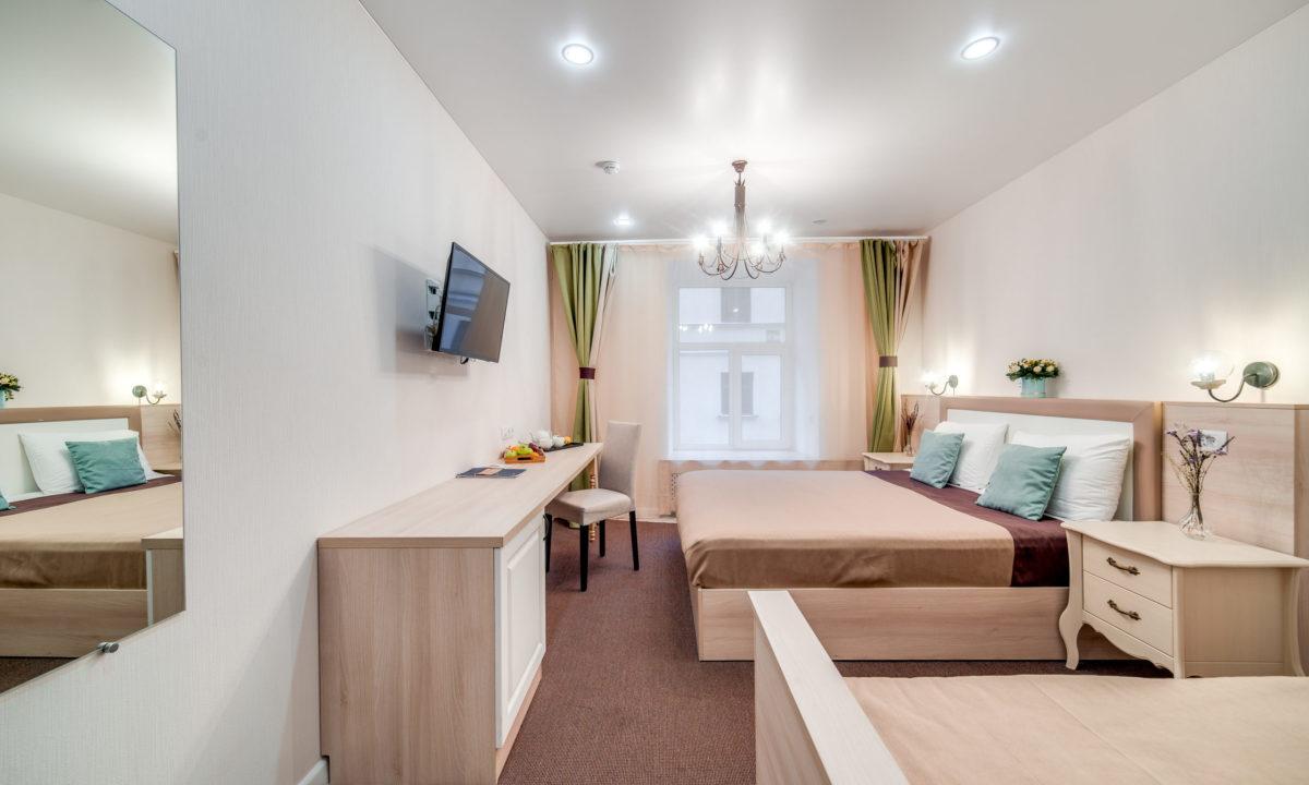 Комфорт 3-местный Количество комнат: 1-комнатный Тип номера: Комфорт Кол-во основных мест: 3 Площадь (кв. м): 17 Мебель: вешалка, кровати односпальные /одна двуспальная кровать, кровать односпальная, прикроватные тумбочки, стол, стул, шкаф Оборудование: кондиционер, мини-холодильник, сейф, телевизор ЖК, чайная станция, чайный набор посуды Санузел: с душевой кабиной, тапочки, туалетные принадлежности, фен Сервис: Wi-Fi бесплатно, смена полотенец, смена постельного белья, уборка номера
