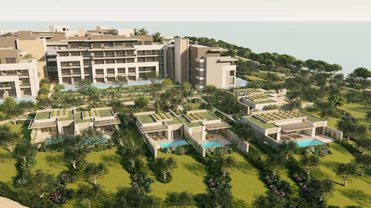 Номер состоит их смежных номеров с одной кроватью размера super king и двух односпальных кроватей, соединенных общим коридором. В комплектации система «Умная комната», телевизор, чайные и гладильные принадлежности, кофемашина, мини-бар, сейф, выпрямитель для волос и фен. В номере гардеробная, санузел с тропическим душем и балкон с видом на море.